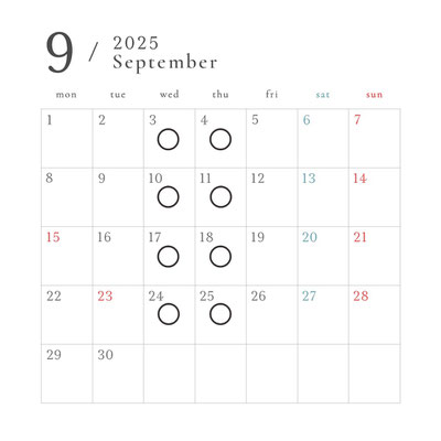 お知らせ · 2025/08/26 9月休業日のお知らせ 〇 のついた日が休業日となります ブライダルの下見は予約のお客様を優先してご案内しております 来店が重なりお客様をお待たせする事のないよう時間調整させて頂ければと思います 営業時間外に来店希望のお客様、お住まいが遠方で来店が難しいお客様もご相談ください 前へ Rの幅広リング 次へ 結婚指輪と重ねるジュエリー tagPlaceholderカテゴリ: お知らせ, 2025年8月