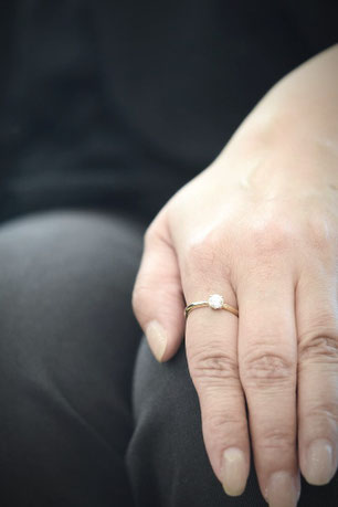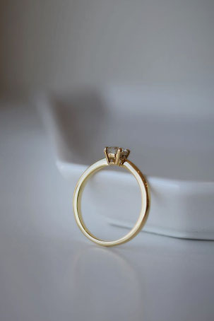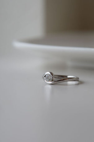 0.547ct のラウンド(丸い)ダイヤは、四隅に爪を配置することでシャープな印象に、リングウデの厚みのある部位を2mmにし中座に向かって細くなるよう絞ったデザインにしました
